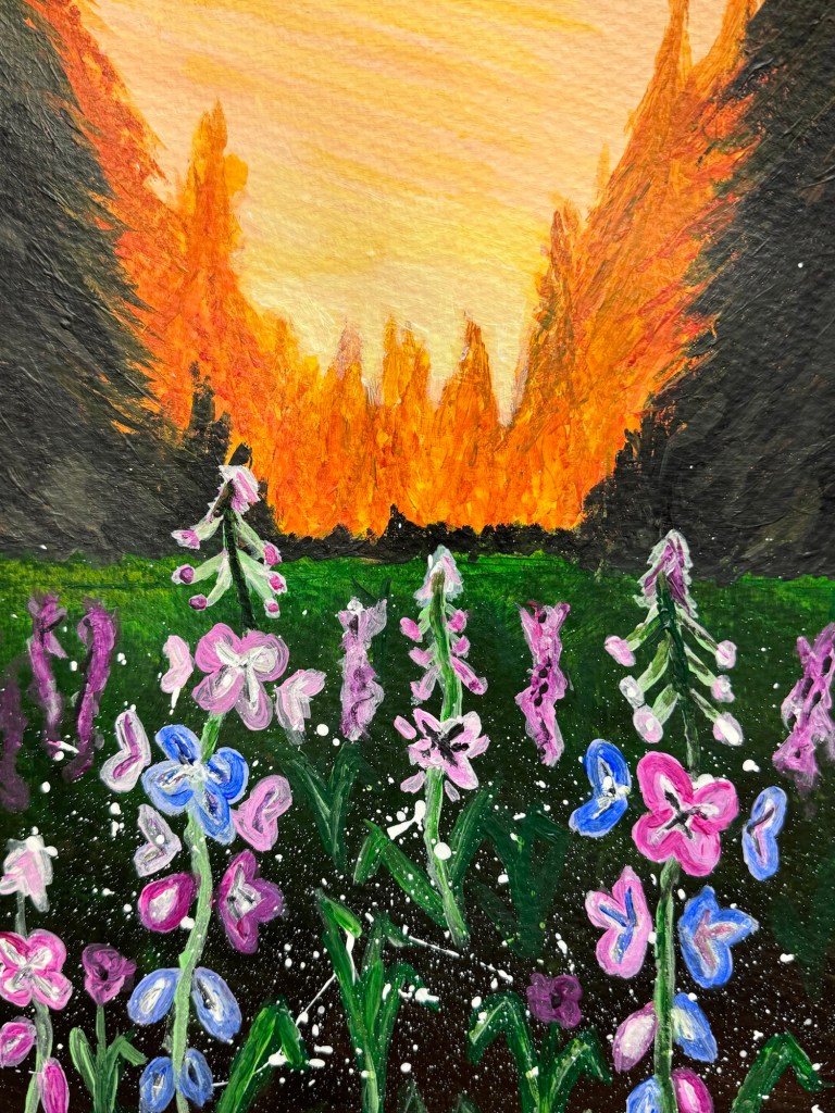 September 1 – Self care is not selfish but essential so today I relaxed by taking an online painting class by Jesse Robertson. Here is my rendition of Fireweed Sunset.