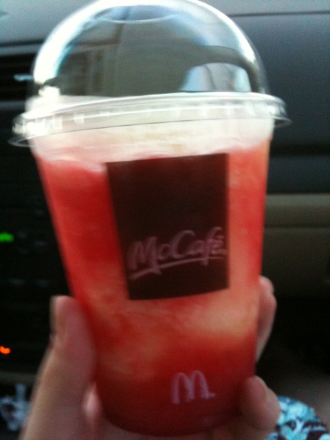 After aqua Zumba, I knew that the only thing waiting at home was a sweltering house. So I decided to stop by McDonald’s to try their new strawberry lemonade. Actually, I thought I had coupon for a free one. Well, I dug through my piles and piles of paper to find the coupons only to discover they expired on June 15. No matter. I will splurge. Two strawberry lemonades-one for E. And one for me. The 16 ounce size costs $1.57. According, to a diet website the 16 ounce size has 270 calories. No problem – I am sure or rather hope I burned as many calories as they advertise when doing Zumba.