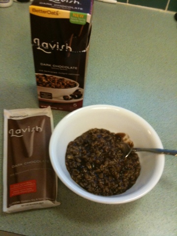 Today I am trying out Lavish. It is old fashion instant oatmeal flavored with dark chocolate. One serving has 160 calories, 2.5 grams of fat, 3 grams of dietary fiber, 4 grams of protein and 12 grams of sugar. This product caught my eye at the grocery store because one of the things I like to eat is old fashion oatmeal sprinkled with dark chocolate chips and a little bit of sweetener.