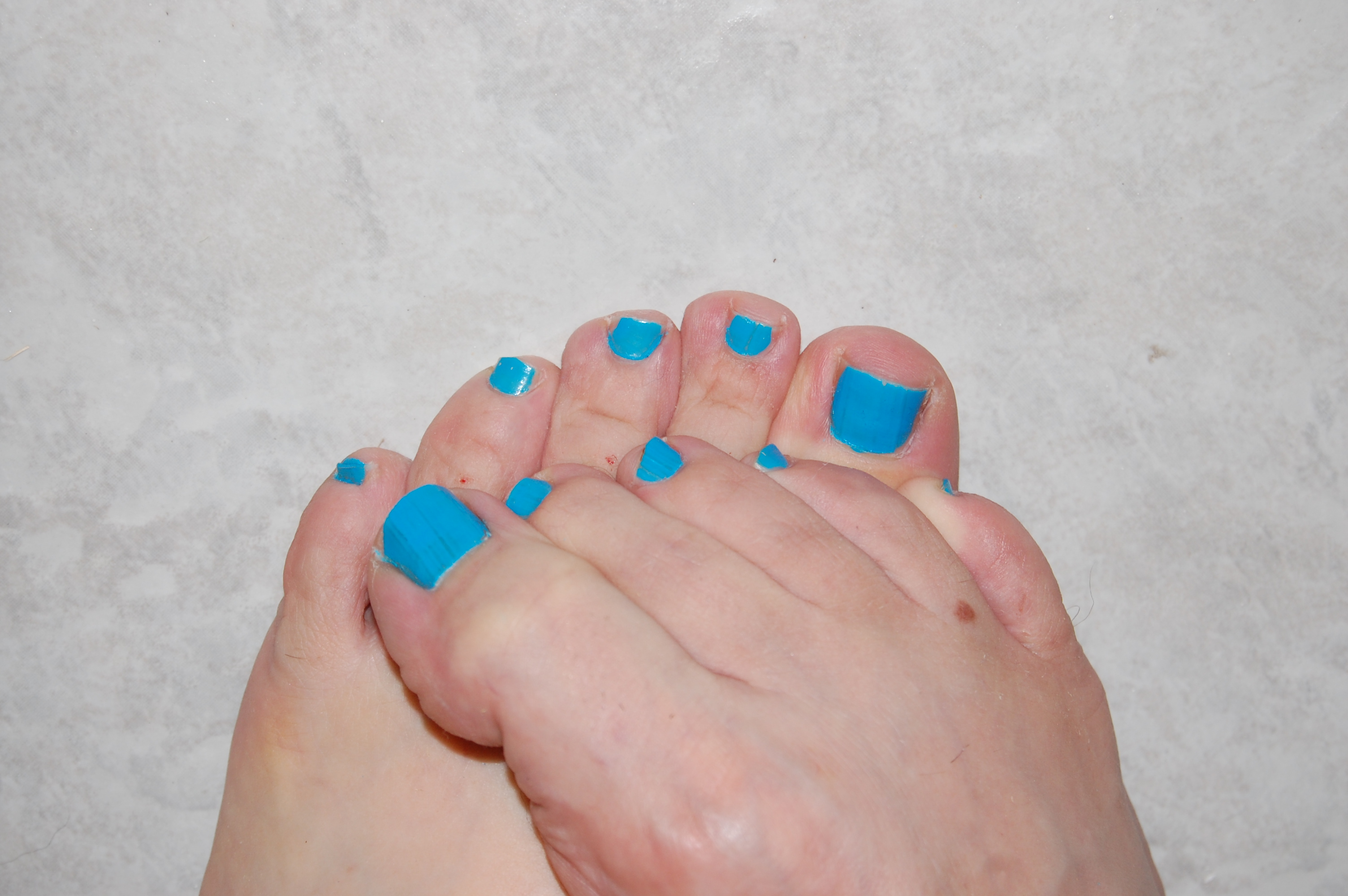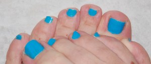 All joking aside.  I did decide to paint my nails.  I saw a woman at church with blue toenails.  When I went to the store I noticed all these colors like blue, green,  and yellow just for toes.  I thought “how cool is that”.  Well, I painted my nails this beautiful shade of blue.  The only problem with my blue toes is that my husband does not like them.  I nearly fell over backwards that he even noticed them.  (This coming from the man who does not notice when I change my hair style.)  So here is my dilemma.  Should people of a certain age wear blue nail polish? (I am nearly half a century old.)  Should I change my color to a “more respectable color” (my husband’s words) like red? I would really like to hear what everyone else thinks about these new colors for toes.