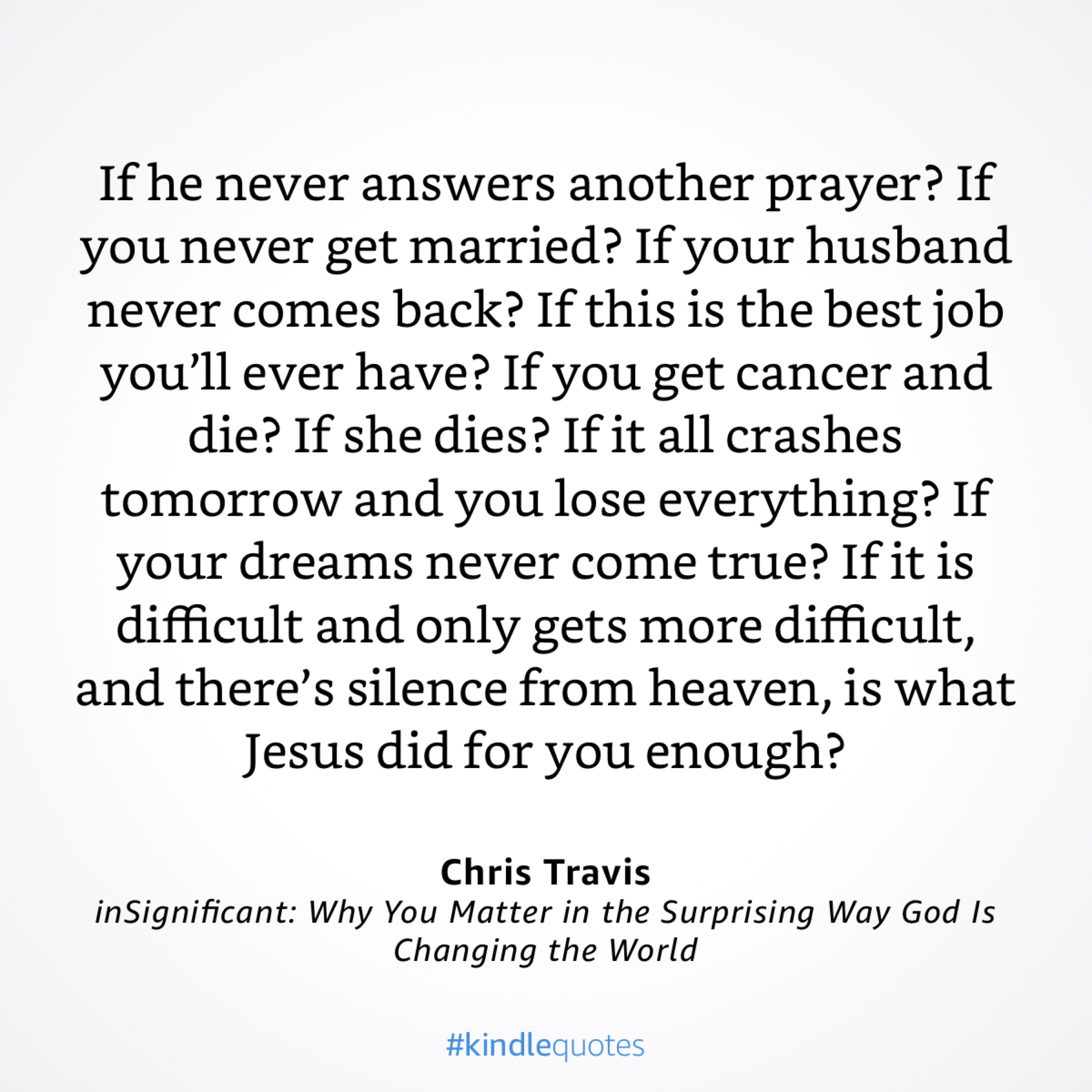 This morning I was reading and eating breakfast. The quote above is from the book I am reading. What a thought to ponder! If I experience situations in my life that are worse or the things in my life stay the same and I feel silence from heaven will I be happy with what Jesus did for me? Sobering thought.
