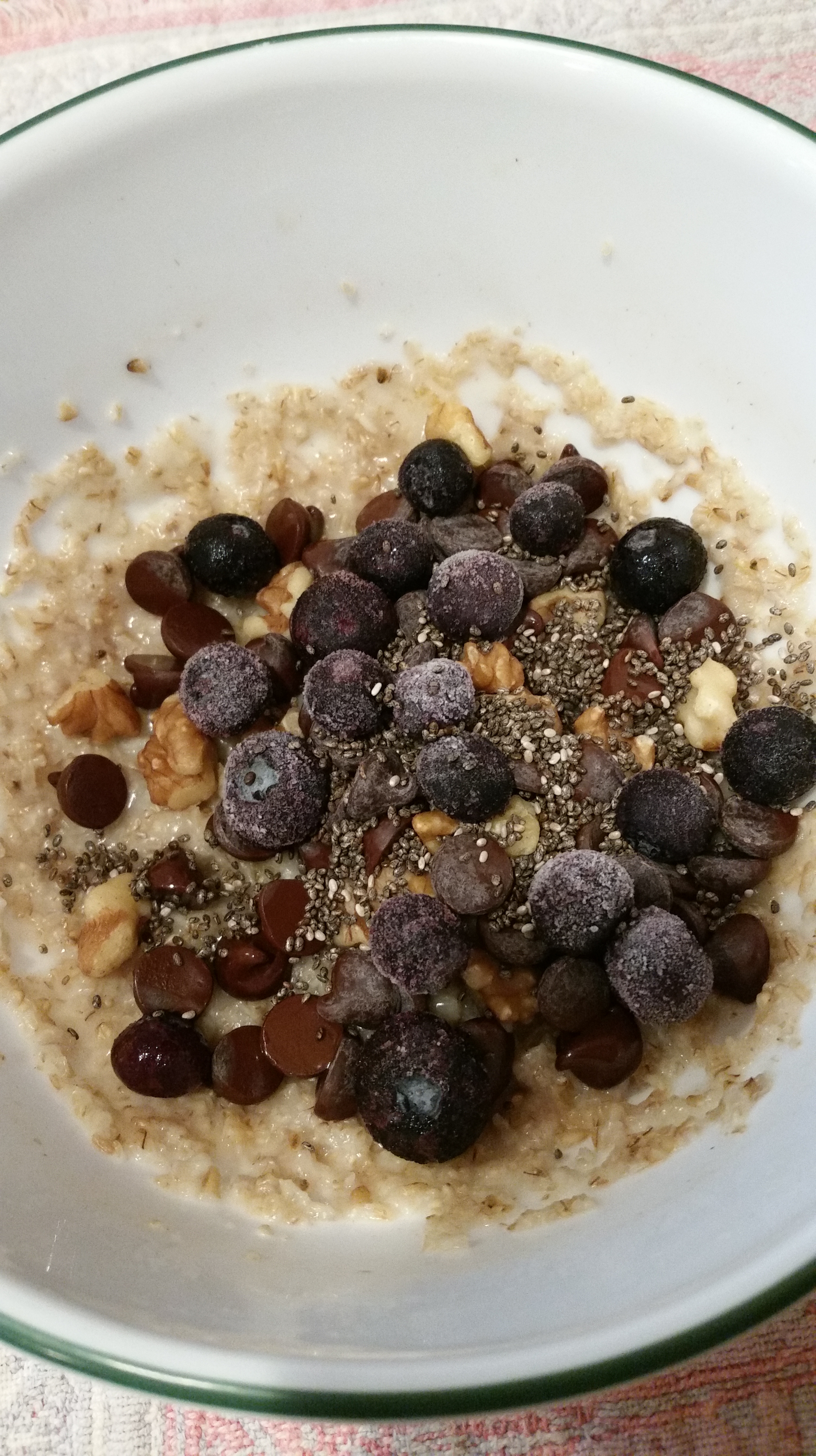 For me there is nothing tastier than steel cut oats, chopped walnuts, dark chocolate chips, and frozen blueberries.  This morning extra special because as I was measuring out the choco chips extra accidentally fell in the bowl. Of course, I could not put them back into the bag….yummy!!! 🤗🤗😍
